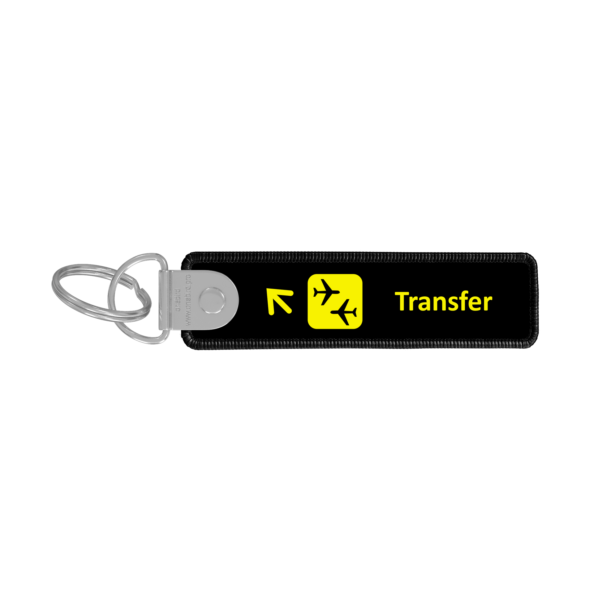 Flame key ring in black fabric which takes up the design of airport signage, it is woven in yellow with: