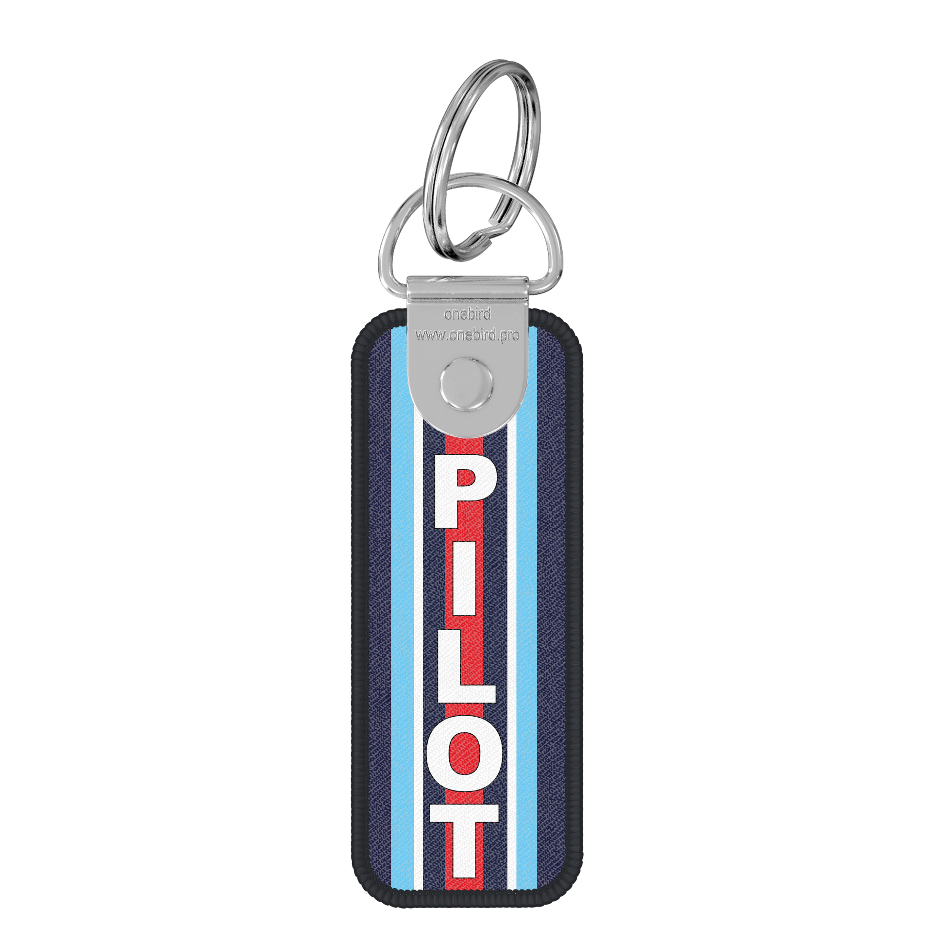 Flame key ring in sky blue fabric with navy blue and white stripes and the text "Pilot" written in white vertically.