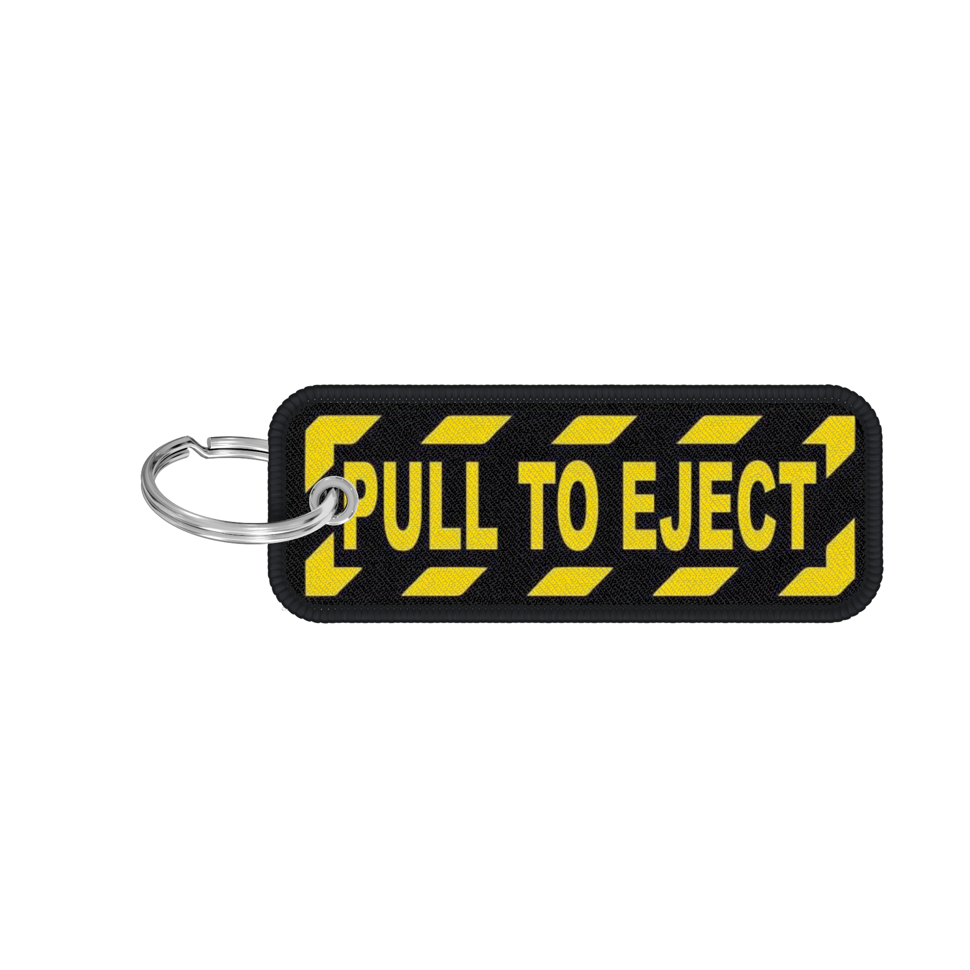 Porte-clés flamme en tissu noir avec des hachures jaune et tissé avec la mention PULL TO EJECT.